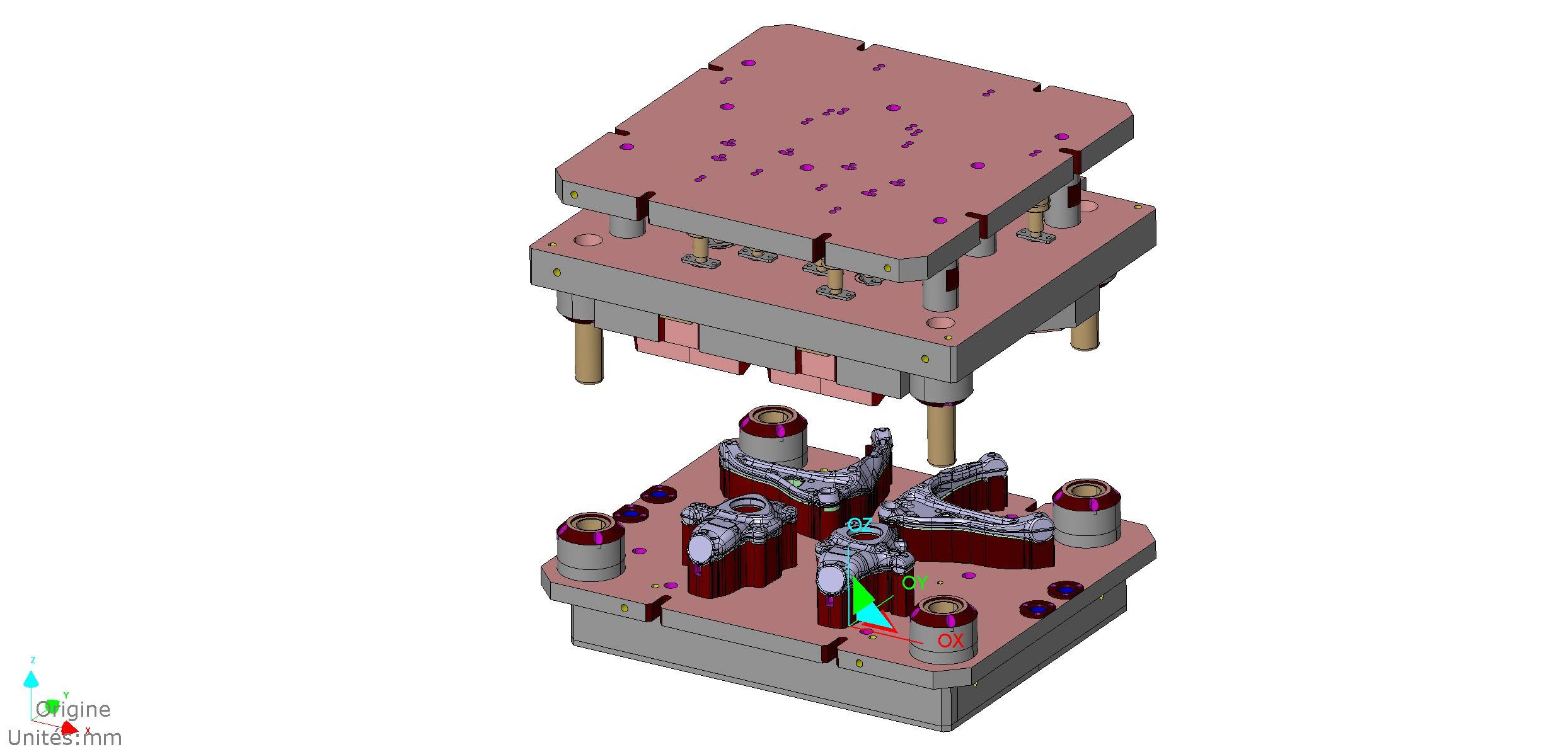 Loire Etude entwirft und fertigt Entgratungswerkzeuge. Bei jedem neuen Projekt arbeitet unsere Forschungsabteilung an der Entwicklung von Werkzeugen (indem sie die Optimierung der Einbettung der Teile in den Werkzeugen untersucht), die es ermöglichen, mehrere Gussteile gleichzeitig zu entgraten, um so die Produktivität zu steigern.
